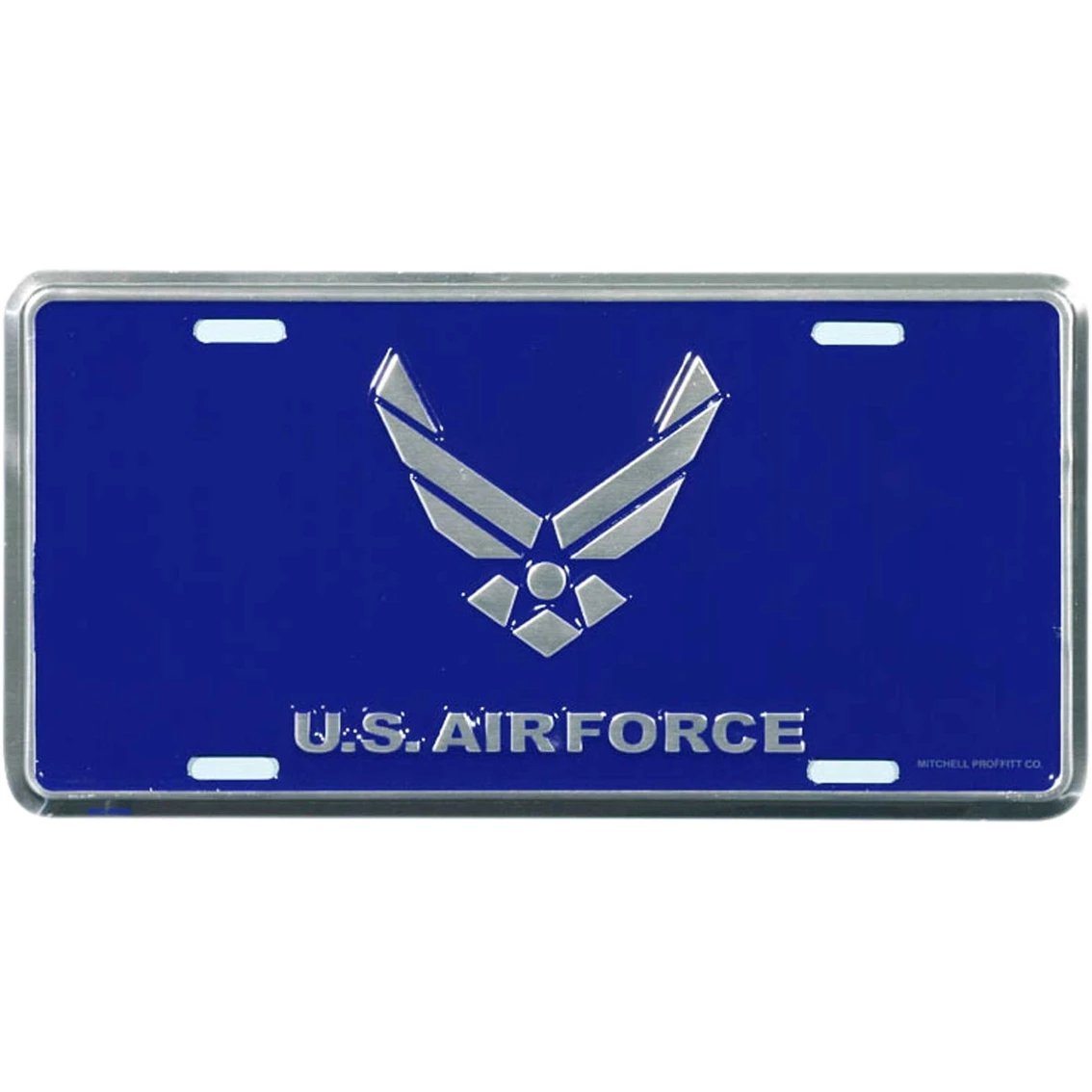 Show your Air Force pride with this Mitchell Proffitt U.S. Air Force License Plate! This silver on royal blue metal license plate from Mitchell Proffitt features the Wing logo with U.S. Air Force below. Made in the USA from recycled aluminum. Model: LAF28.