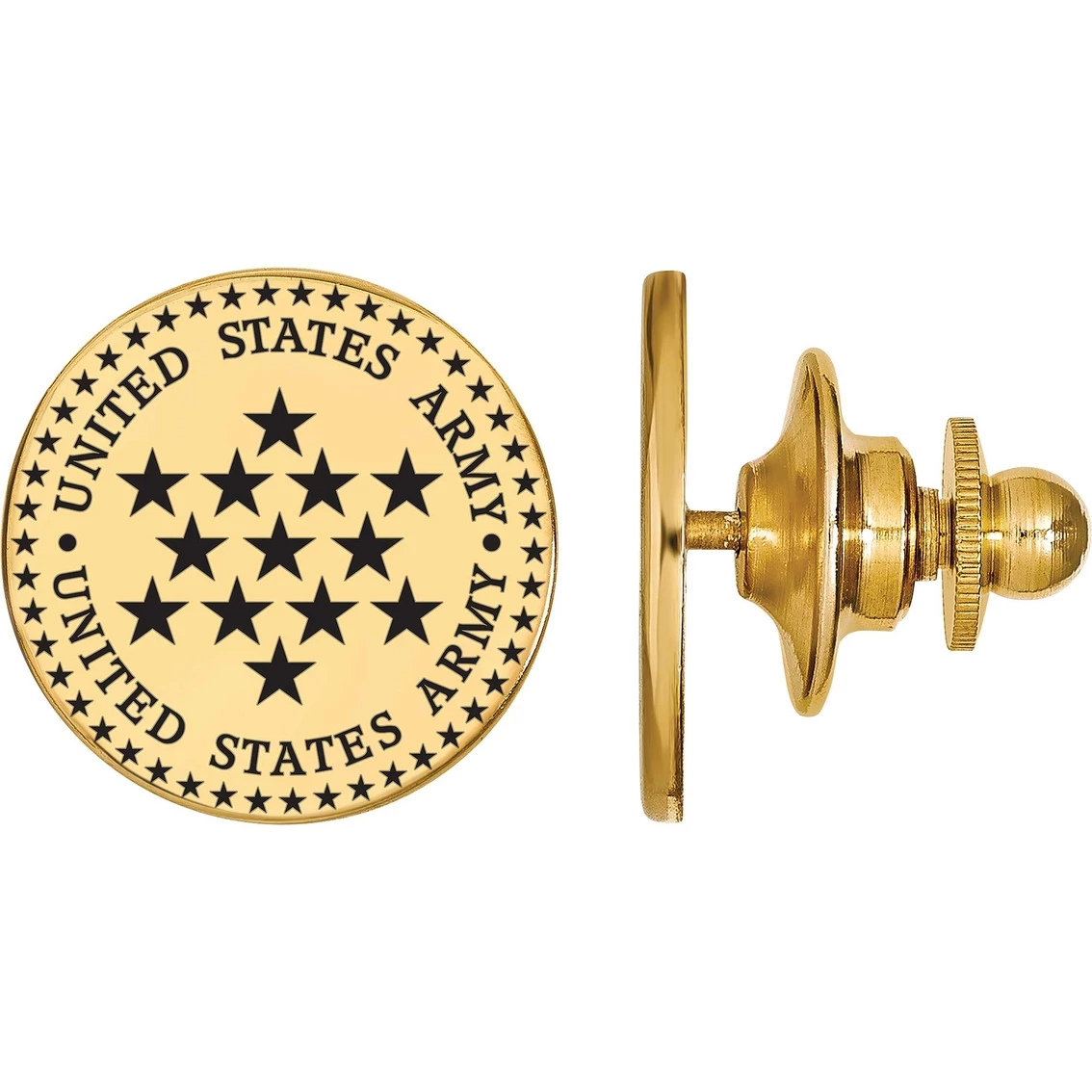 Proudly show your profession with this stunning disc lapel pin. Designed from 18 karat gold plated sterling silver, this disc lapel pin is inscribed with “United States Army” and stars in black epoxied for a wonderful look. Show your love for the Army with this striking lapel pin. Style: GP016ARM.