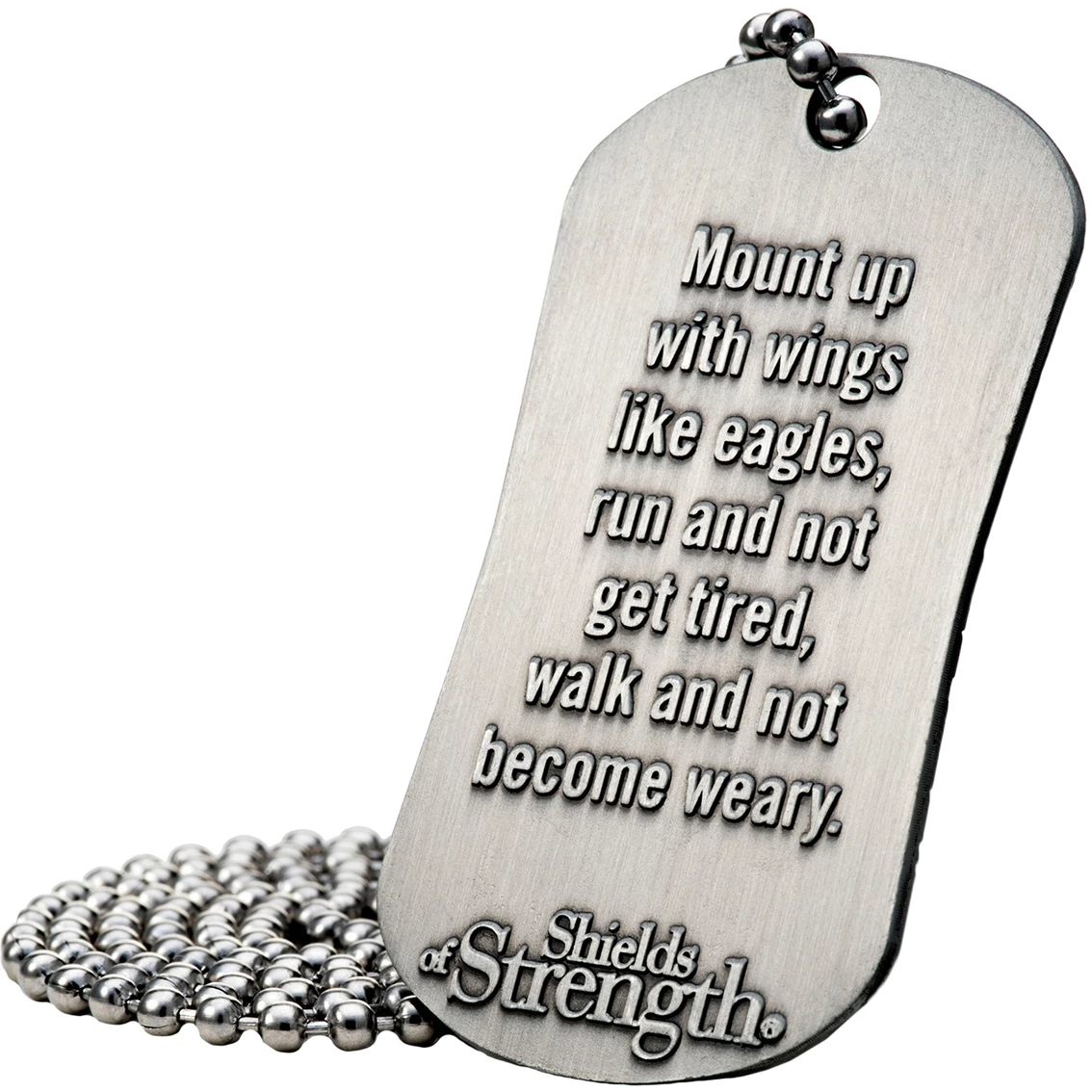 DoDI Number 1300.17 authorizes this religious medallion for wear with military uniforms; clean with soap, water, soft cloth; 24 inch hypoallergenic stainless steel ball chain; Same size as Government Issued Identification tag; Isaiah 40:31
