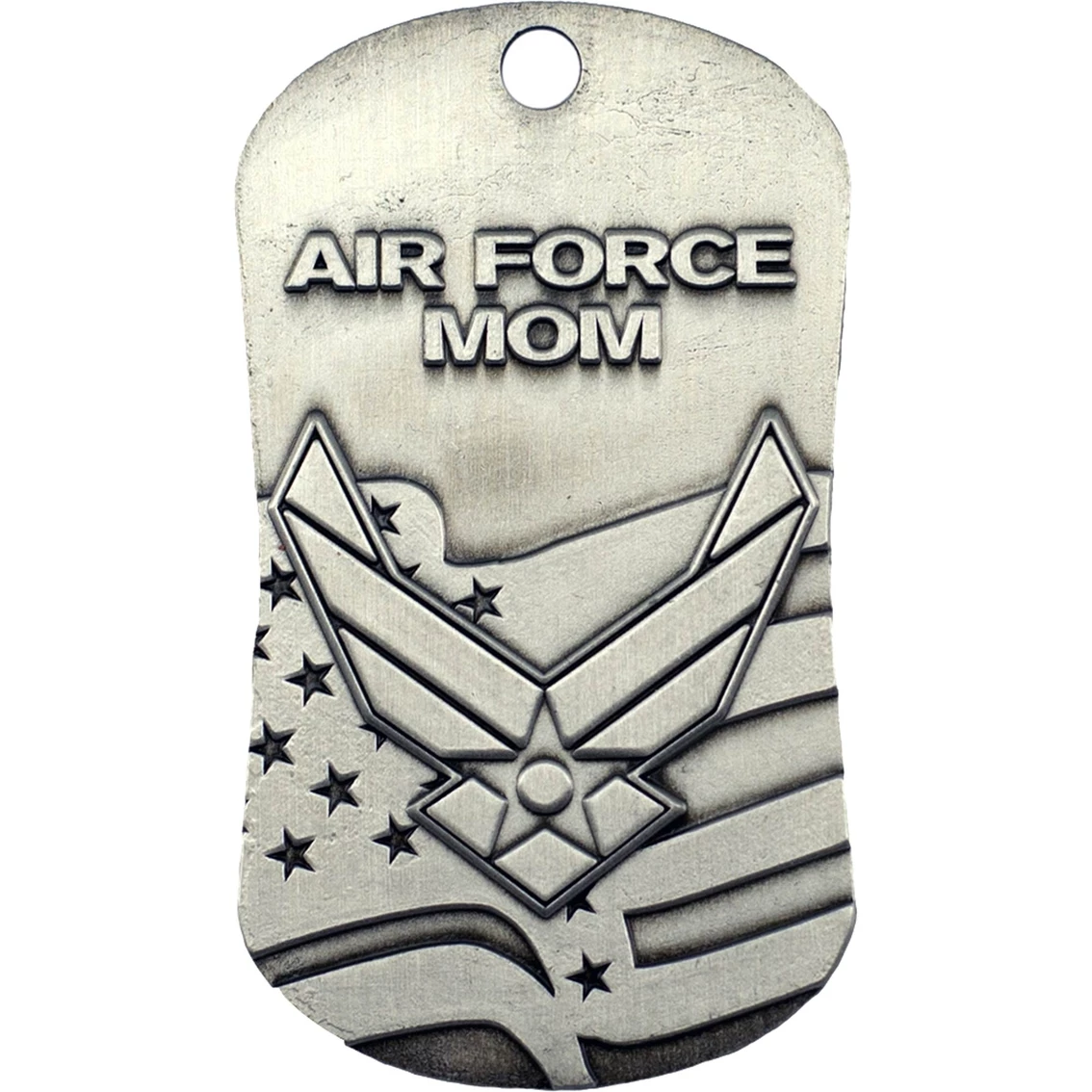 This antique finish Dog Tag Necklace from Shields of Strength includes “Air Force Mom” and symbol on the front and “Mount up with wings like eagles, run and not get tire, walk and not become weary,” on the back. This zinc pendant is the same size as a government issued identification tag and comes with a 24-in. stainless steel chain.