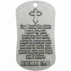 With verses on both sides, the Jeremiah 29: 11/2 Corinthians 10:5 antique finish dog tag chain from Shields of Strength is made of zinc. On one side, it features the promise declared in Jeremiah 29:11, “For I know the plans I have for you, declares the Lord, plans to prosper you and not to harm you, plans to give you a hope and a future.” The other side includes the engraved instructions given in 2 Corinthians 10:5, “I cast down imaginations, and everything that exalteth itself against the knowledge of God, and bring into captivity every thought to the obedience of Christ.” This dual promise and command is at the heart of the word of God, and this tag makes the perfect gift for someone starting a new phase in life. The dog tag necklace comes with a 24-in. stainless steel chain and measures 1.95 in. long by 1.08 in. wide. Style: 10210.