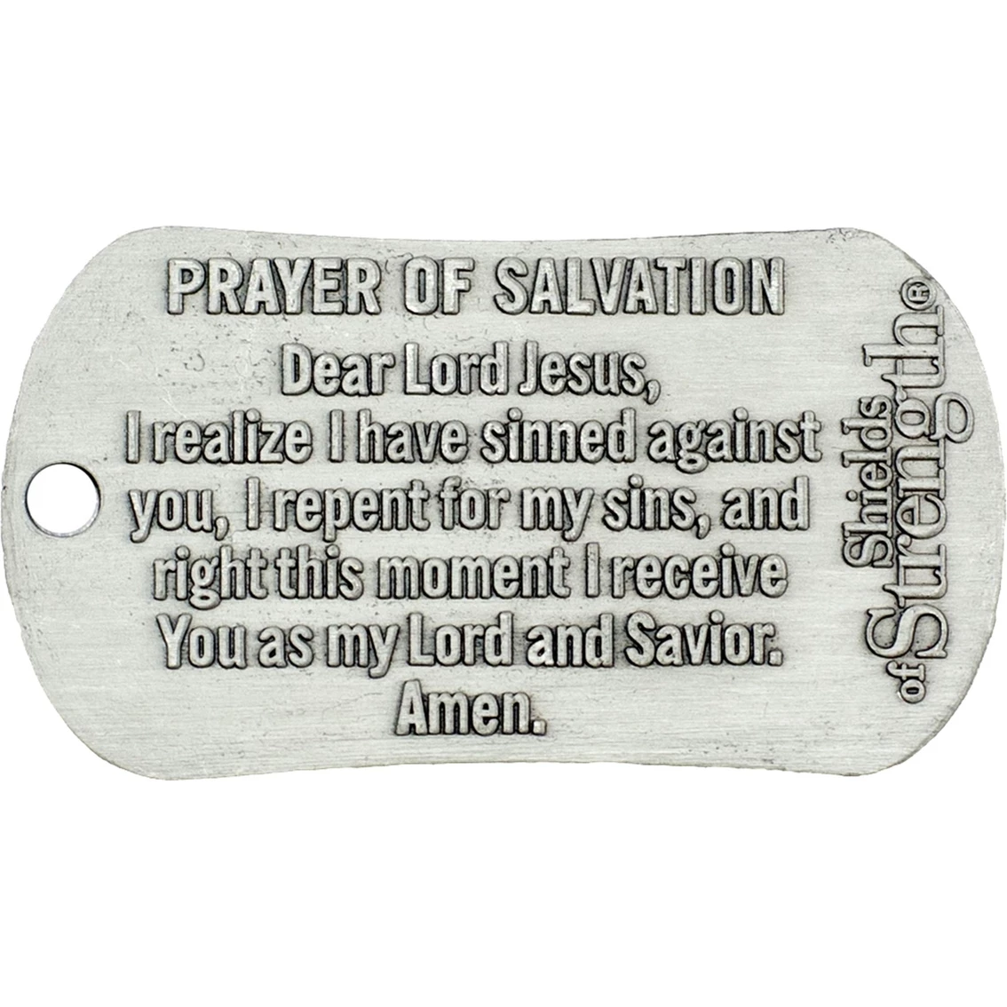 Show off your patriotic and spiritual sides in a single piece from Shields of Strength. The Joshua-flag antique finish dog tag necklace includes an engraved tag and a ball chain. The front side of the tag depicts an engraved American flag waving in the wind with text from Joshua 1:9, “I will be strong and courageous. I will not be terrified, or discouraged; for the Lord my God is with me wherever I go.” On the reverse, the tag displays the full text of The Prayer of Salvation, “Dear Lord Jesus, I realize I have sinned against you, I repent for my sins, and right this moment I receive You as my Lord and Savior. Amen.” The zinc tag is 1.95 in. by 1.08 in., and the stainless steel dog tag chain measures 24 in. long.