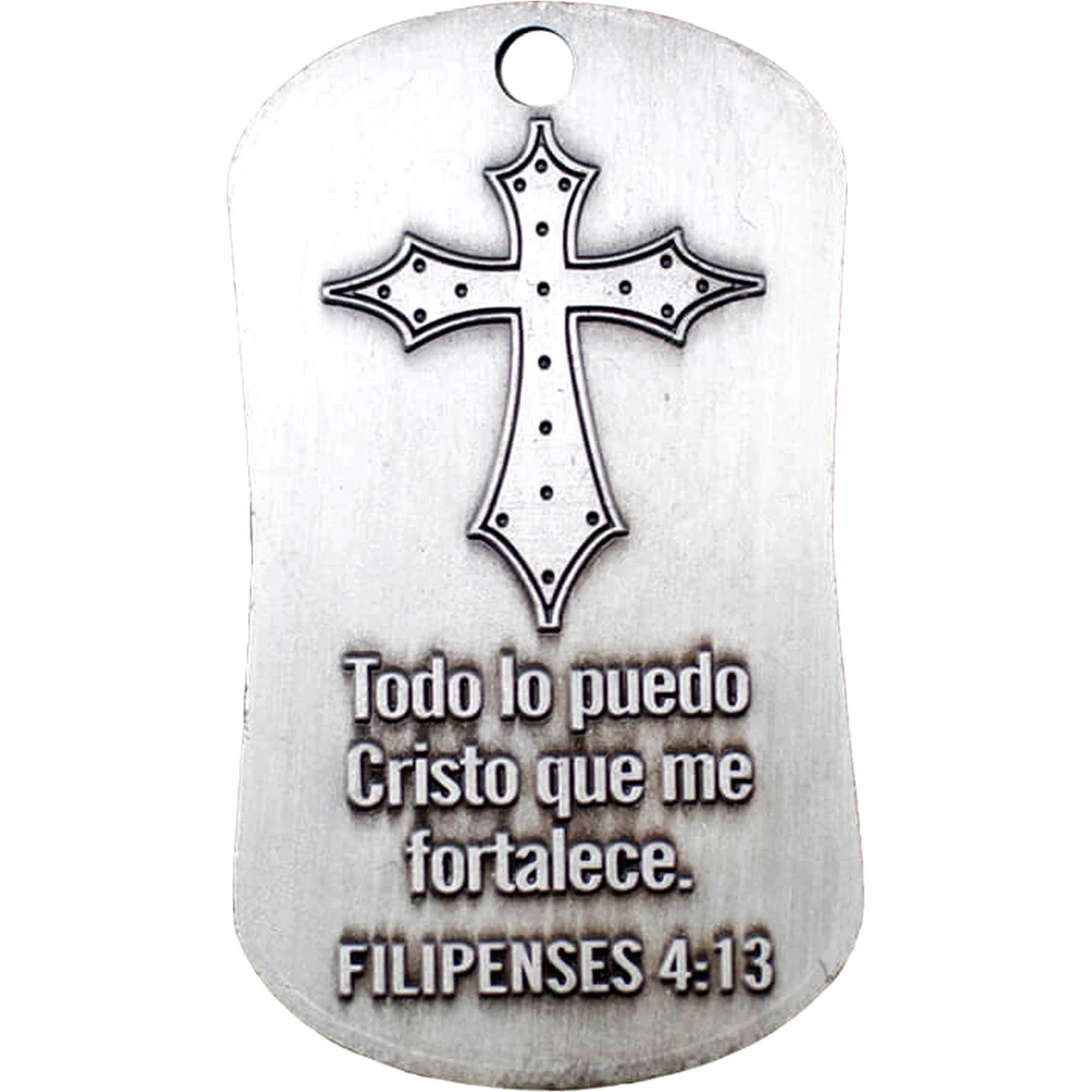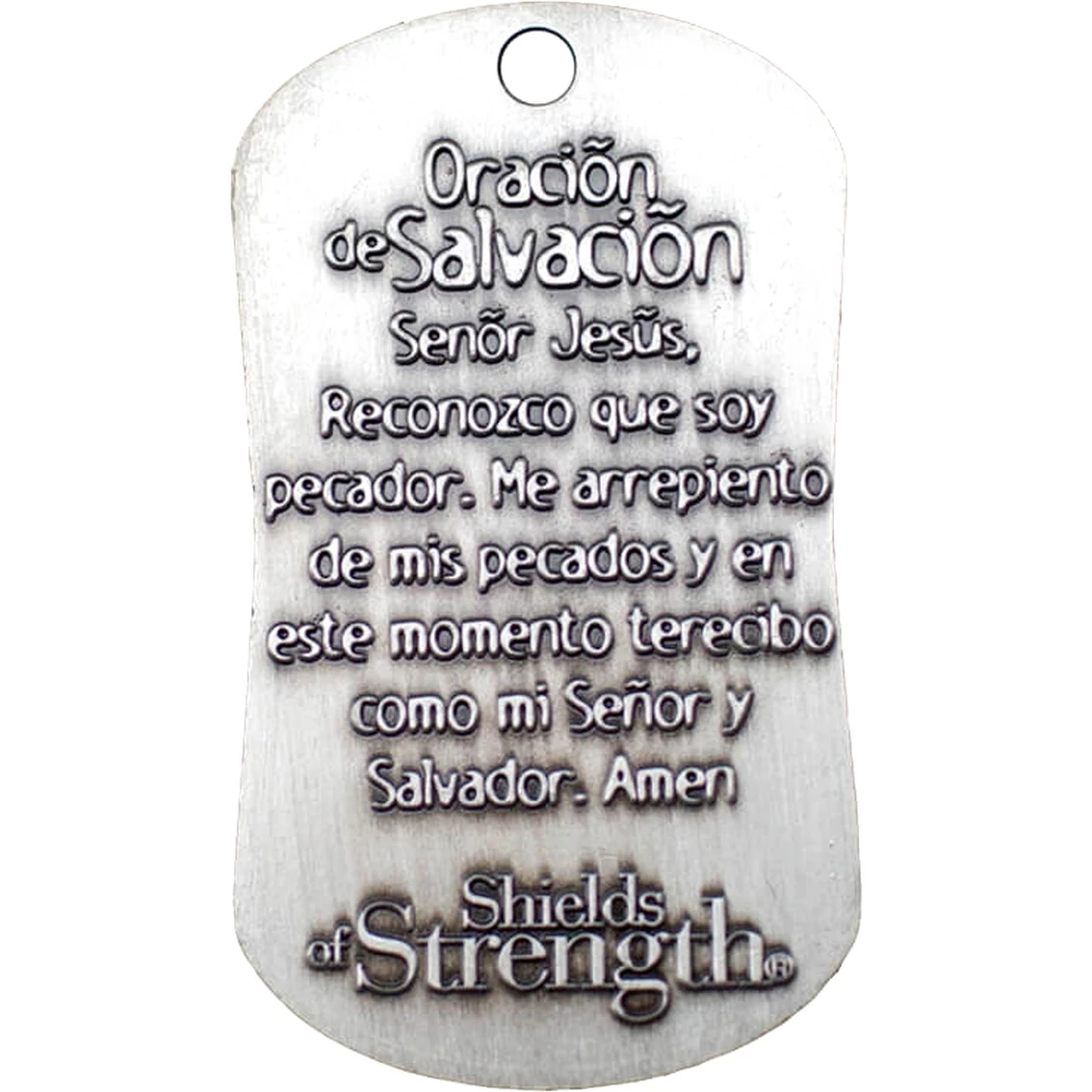 The Spanish antique finish dog tag necklace from Shields of Strength features the inspiring words of Philippians 4:13 engraved on one side, “Todo lo puedo Cristo que me fortalece.” It displays a cross on the other side along with the Prayer of Salvation, “Senor Jesus, Reconozco que soy pecador. Me arrepiento de mis pecados y en este momento te recibo como mi Senor y Salvador. Amen.” The dog tag necklace measures 1.95 inches long by 1.08 inches wide and has an antique finish that makes it perfect for daily wear. It comes with a 24-inch stainless steel ball dog tag chain. Wear Christian jewelry to remind you that everything is possible with Christ and that God is always there to provide unconditional love and support. Give it as a gift for a special occasion, or present it to someone who needs a constant reminder of God’s Word.