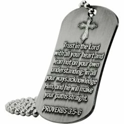 On the back of the dog tag necklace is the Prayer of Salvation, which welcomes anyone into the Christian faith: “Dear Lord Jesus, I realize I am a sinner, I repent for my sins, and right this moment, I receive you as my Lord and Savior. Amen.” This fantastic piece of Proverbs jewelry is the perfect gift for young Christians, students, and those growing in their faith. It comes with a 24-inch stainless steel ball chain.