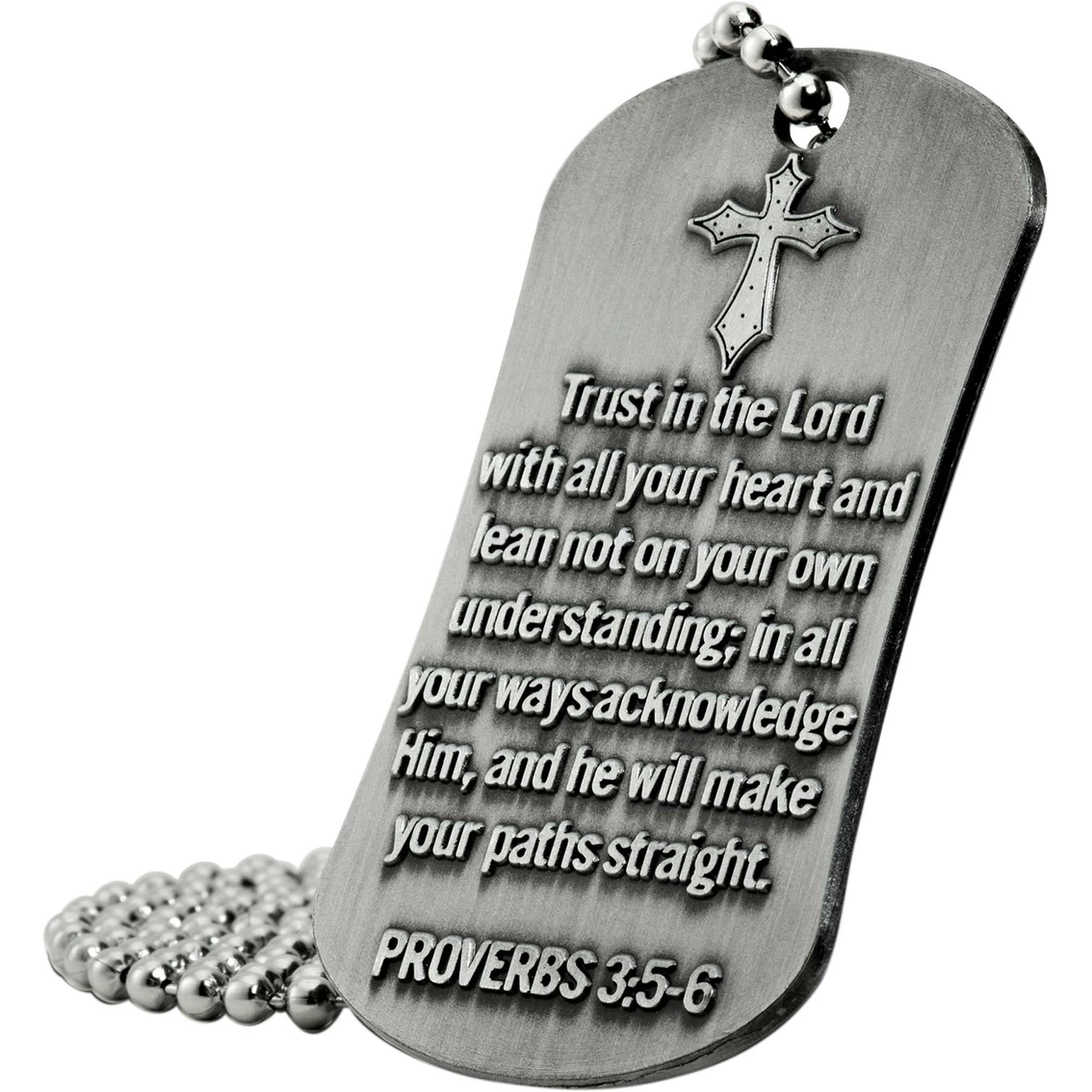 Christian jewelry helps keep God’s word close to your heart all day. The Shields of Strength Proverbs 3:5-6 necklace features an antique finish and is made of zinc. It measures 1.95 inches long by 1.08 inches wide. It features an engraving of a small cross on the front with the words of Proverbs 3:5-6 underneath, “Trust in the Lord with all your heart and lean not on your own understanding. In all your ways acknowledge Him, and He will make your paths straight.”