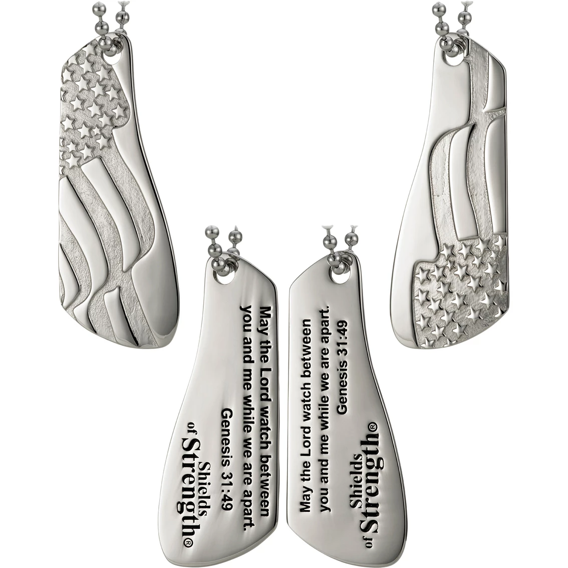 Friends and loved ones can share a bond stronger than the distance that separates them when they each wear one half of a Shields of Strength antique split shield dog tag that keeps them connected, even when apart. Military members and their families can be reminded of God’s enduring strength and the bond that ties with Genesis 31:49 etched into the back of each side of the dog tag. With an embossed American flag on the front and the verse “May the Lord watch between you and me while we are apart” on the reverse, this Christian jewelry is sure to reinforce a special bond. The zinc tag measures 1.95 inches by 1.05 inches, is detachable, and features two 24-inch ball chains so that either charm can be worn by separate wearers. All components clean with warm soapy water or a polishing cloth. Style: 30249-24.
