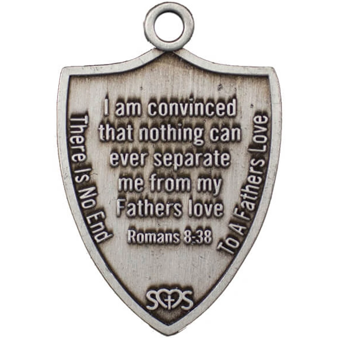 The Shield of Strength T.I.N.E.T.A.F.L. (There Is No End To A Fathers Love) Antique Finish Christian Shield Pendant features the engraved verse of Romans 8:38, on one side “I am convinced that nothing can ever separate me from my Fathers love.” – Romans 8:38 and the T.I.N.E.T.A.F.L. on the other side. Style: 30214.