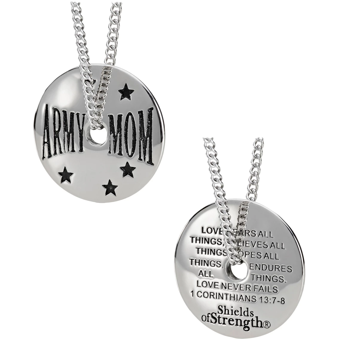 Love endures, and with God’s grace, so will you and your army children. No matter how great the distance between you and them, the Shields of Strength women’s stainless steel Army mom necklace is a source of comfort, reminding you that love is without bounds and endures all hardships. This beautiful piece of Christian jewelry comprises a stainless steel chain, and a 1-in. diameter pendant. The front of the pendant is embossed “Army mom,” while the reverse bears the words of 1 Corinthians 13:7-8, “Love bears all things, believes all things, hopes all things, endures all things. Love never fails.” These comforting words are a constant reminder that when people are in your heart, they are never far away, making the necklace the perfect gift for any woman of faith whose children are in the Armed Forces. Clean with a polishing cloth. Style: 29201-20.
