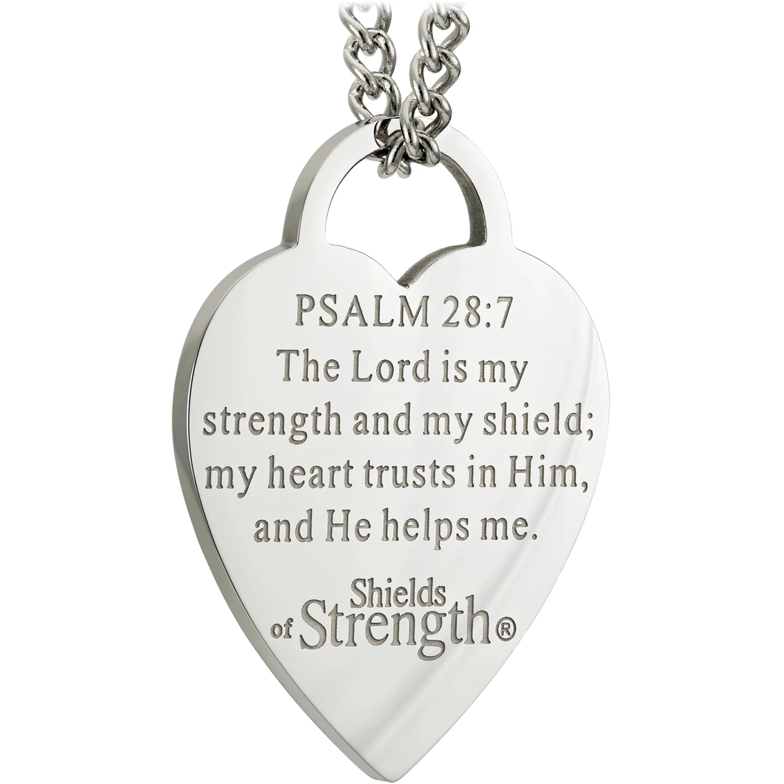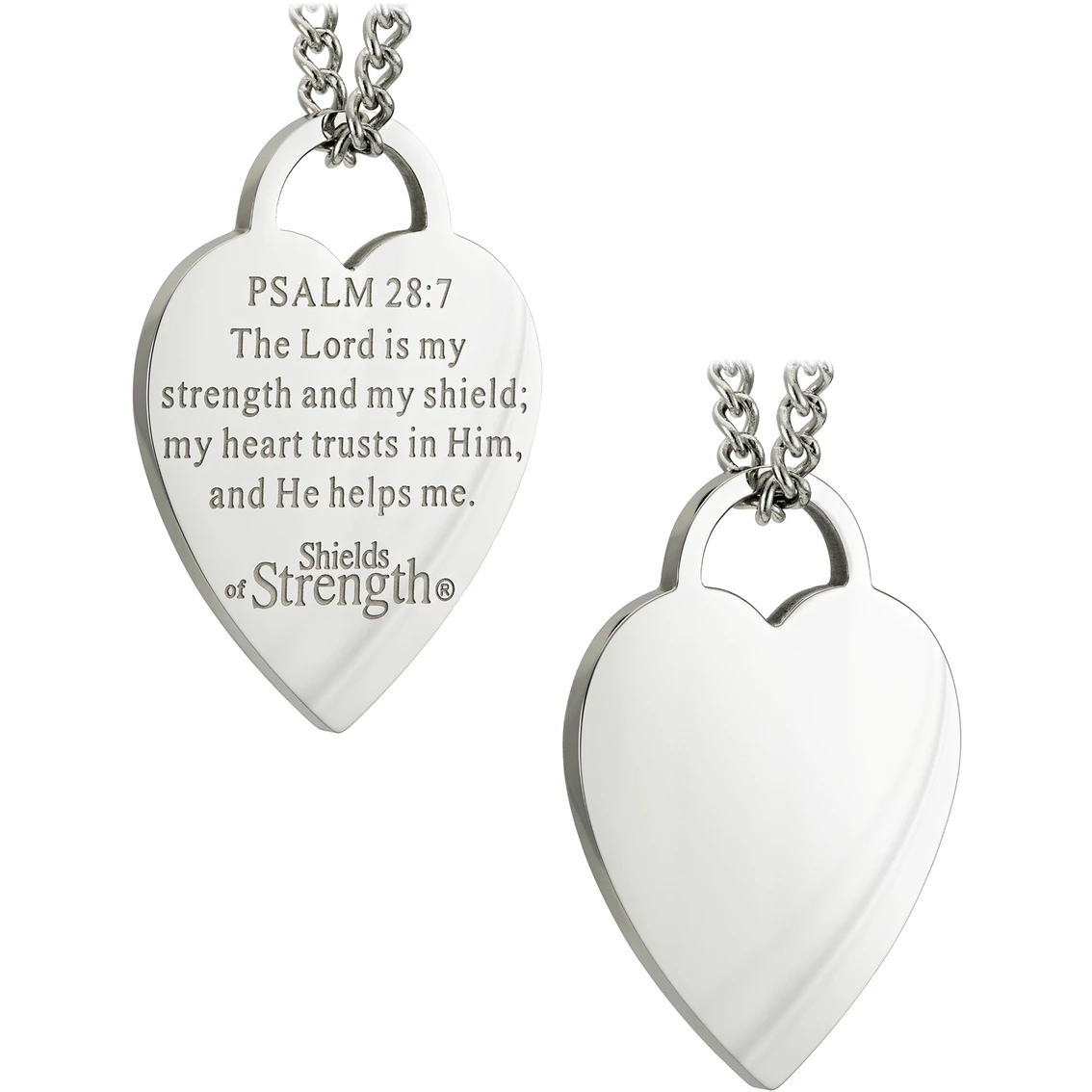 Keep the Word of God close to your heart and trust in His love and protection wearing the Shields of Strength women’s stainless steel thin heart necklace. This timeless piece of Christian jewelry comprises a 1.03-inch by 0.77-inch stainless steel mini heart charm on a stainless steel chain, and it is easy to clean with a polishing cloth to retain its luster. The reverse of the charm features the embossed words of Psalm 28:7, “The Lord is my strength and my shield, my heart trusts in Him, and He helps me,” which serves as a powerful reminder that God is always there. The motivational message combined with elegant style makes this necklace an ideal gift for any woman of faith, particularly if she is in need of emotional support in times of hardship. Model: 28299-20.