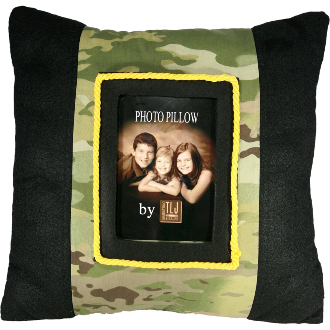 Insert your favorite snapshot or family photo into this innovative and stylish Multi Cam Photo Pillow. Transparent pocket framed with gold cord holds photo. Transparent pocket framed with gold cord holds photo. Model: PHP-MCAM.