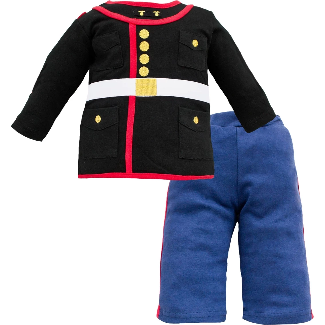 The saying “Everyone loves a man in uniform” holds even more truth with the Tiny Trooper Marine Dress Blues Uniform from Trooper Clothing. This set includes a top with gold embroidered buttons and back snaps for easy dressing and a bottom with an elastic waistband. Both pieces are made of 100% soft cotton. Style: 5852.