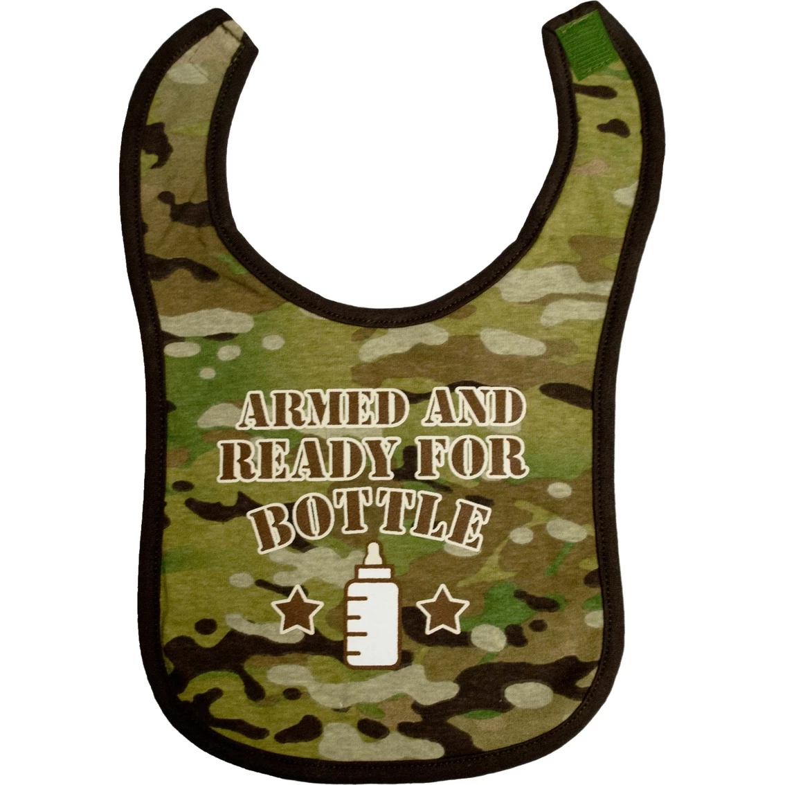 This bib from Trooper Clothing is made from premium Multicam cotton fabric and features the cute slogan, Armed and Ready for Bottle screen-printed on the front. Your baby will be looking sharp when it’s time for chow! The back side is trimmed with soft cotton fabric and has a hook-and-loop neck closure. Hooah! Style: 2552T.