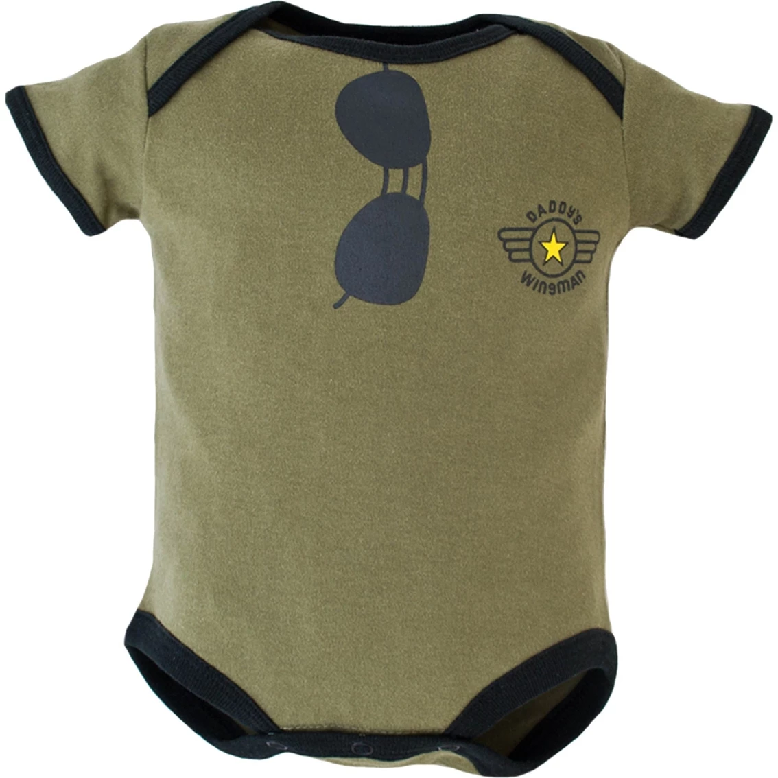 Get this bodysuit for Daddy’s Wingman. Your Little Fly Boy will be looking sharp in this bodysuit from Trooper Clothing. The bodysuit features screen-printed aviator glasses and Daddy’s Wingman logo on the front chest. Three snap opening allows for easy diaper changes. Style: 403.