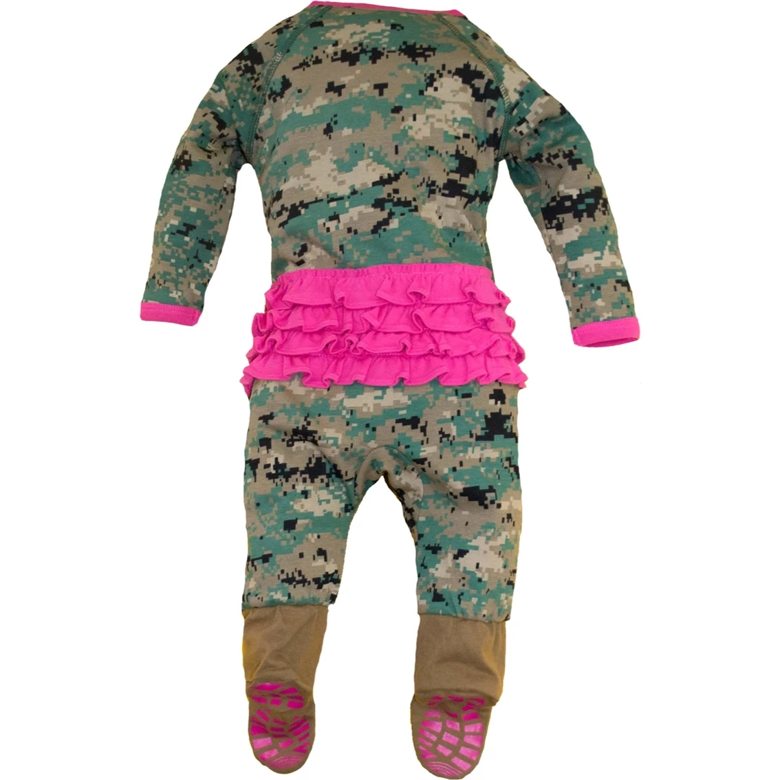 Do you have a Future Devil Dog that needs a baby uniform? Trooper Clothing has got you covered! This adorable long-sleeve crawler is embroidered with name tapes that say Cute and Recruit on them. It also features pink trim, boot laces, a ruffled bottom and flap pockets on the chest, easy zipper for quick diaper changes and screen-printed combat boots on the feet! Trooper Clothing has covered all of the cute details on this design. Get your Girly Grunt geared up today! Style: 5303.