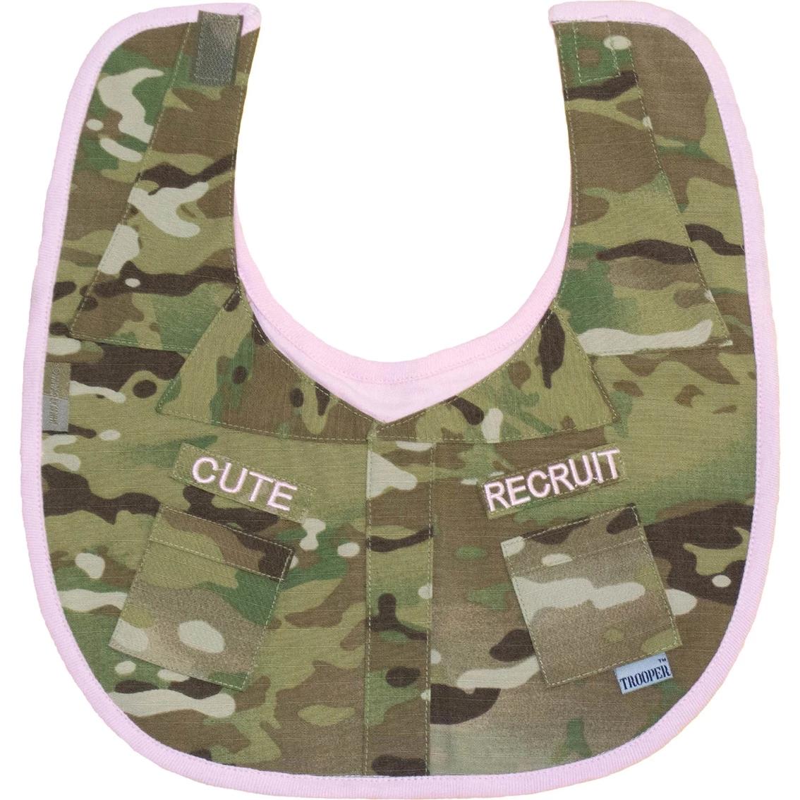 The details on this Multicam Cute Recruit Uniform bib from Trooper Clothing are just like the adult uniforms! Your recruit will be looking sharp when it’s time for chow. Name tapes are embroidered and say “Cute Recruit” on them. The back side is trimmed with soft cotton Pink fabric and has a hook-and-loop neck closure. Get yours today. Hooah! Style: 2101.