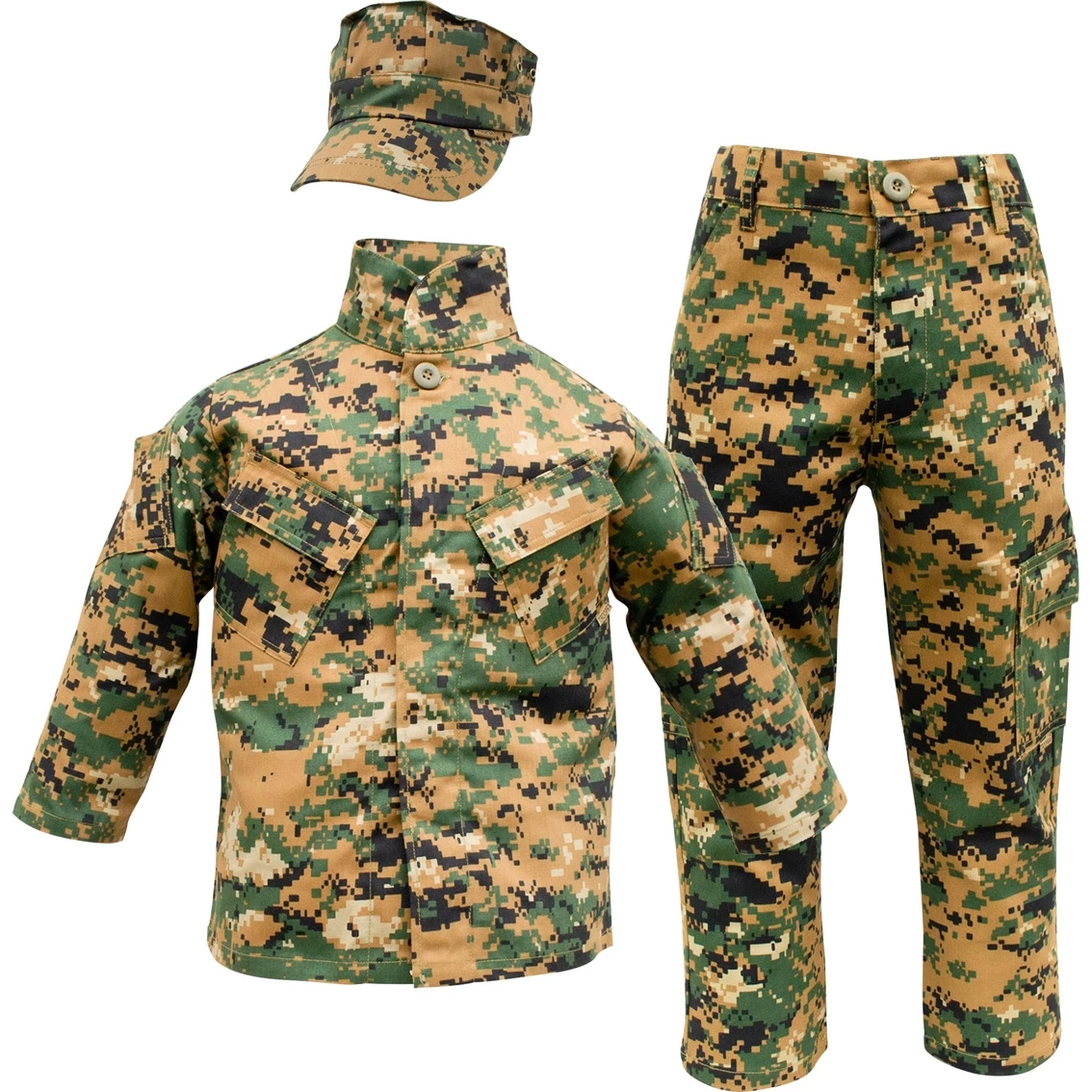 This military look 3-piece Digitized Marine Woodland Uniform Set from Trooper Clothing comes with an 8-point cover with Velcro closure for easy fastening, a long-sleeve button-down top with four pockets and a pair of pants with six pockets. This set is perfect for the child who wants to honor his or her military loved ones! Made with a digital Marine Woodland Camouflage print (MARPAT), this uniform is the closest to the original issue uniform you can find on the market. Machine washable 60/40 cotton/polyester blend. Oorah! For youth boys and girls. Style: 151.