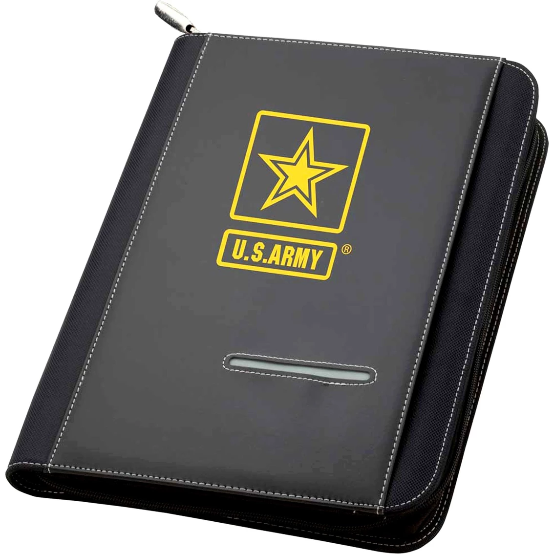 This U.S. Army logo padfolio from TLJ Marketing & Sales zips up to keep contents secure. Outside slot pocket keeps cards or ID handy. Style: SZ693-AR.